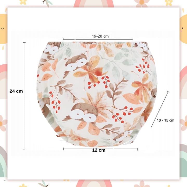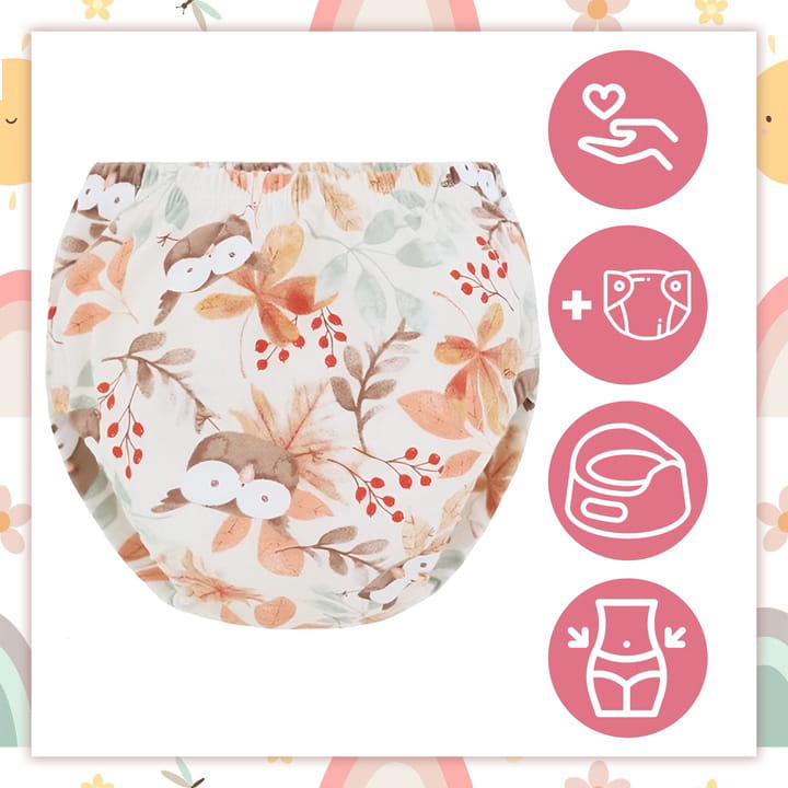 Pieluchy treningowe wykonane są z wysokiej jakości bawełny, zapewniającej komfort i przewiewność. Są dostępne w przedziale wagowym 12–16 kg. W zestawie znajdują się 3 pary majtek we wzorach: JARZĘBINKI, BEŻOWE I TĘCZE.