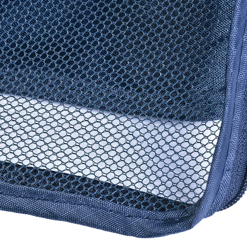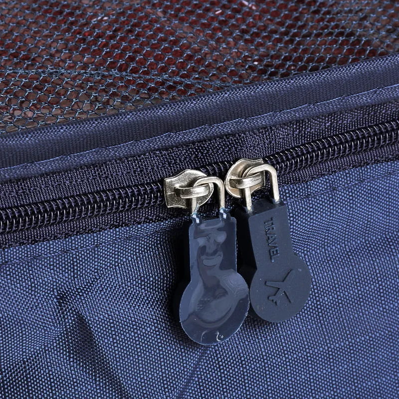 Torby zostały wykonane ze śliskiego i wytrzymałego materiału. Trzy z nich są w formie saszetki, pozostałe mają wstawki z siatki i dodatkowo uchwyty do przenoszenia. Organizery są zamykane na zamek.